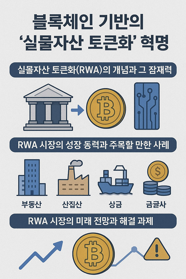 안녕하십니까, 여러분. 오늘날 금융 시장의 가장 뜨거운 화두 중 하나는 바로 '실물자산 토큰화(Real World Assets Tokenization, RWA)'입니다. 이 개념은 비트코인 현물 ETF 승인 이후 암호화폐 시장의 다음 주류 트렌드로 각광받고 있으며, 제도권 금융의 미래를 송두리째 바꿀 잠재력을 지니고 있습니다. 이번 글에서는 RWA가 무엇이며, 왜 이 기술이 금융 산업의 혁신을 이끌 핵심 동력으로 평가받는지 자세히 살펴보겠습니다.